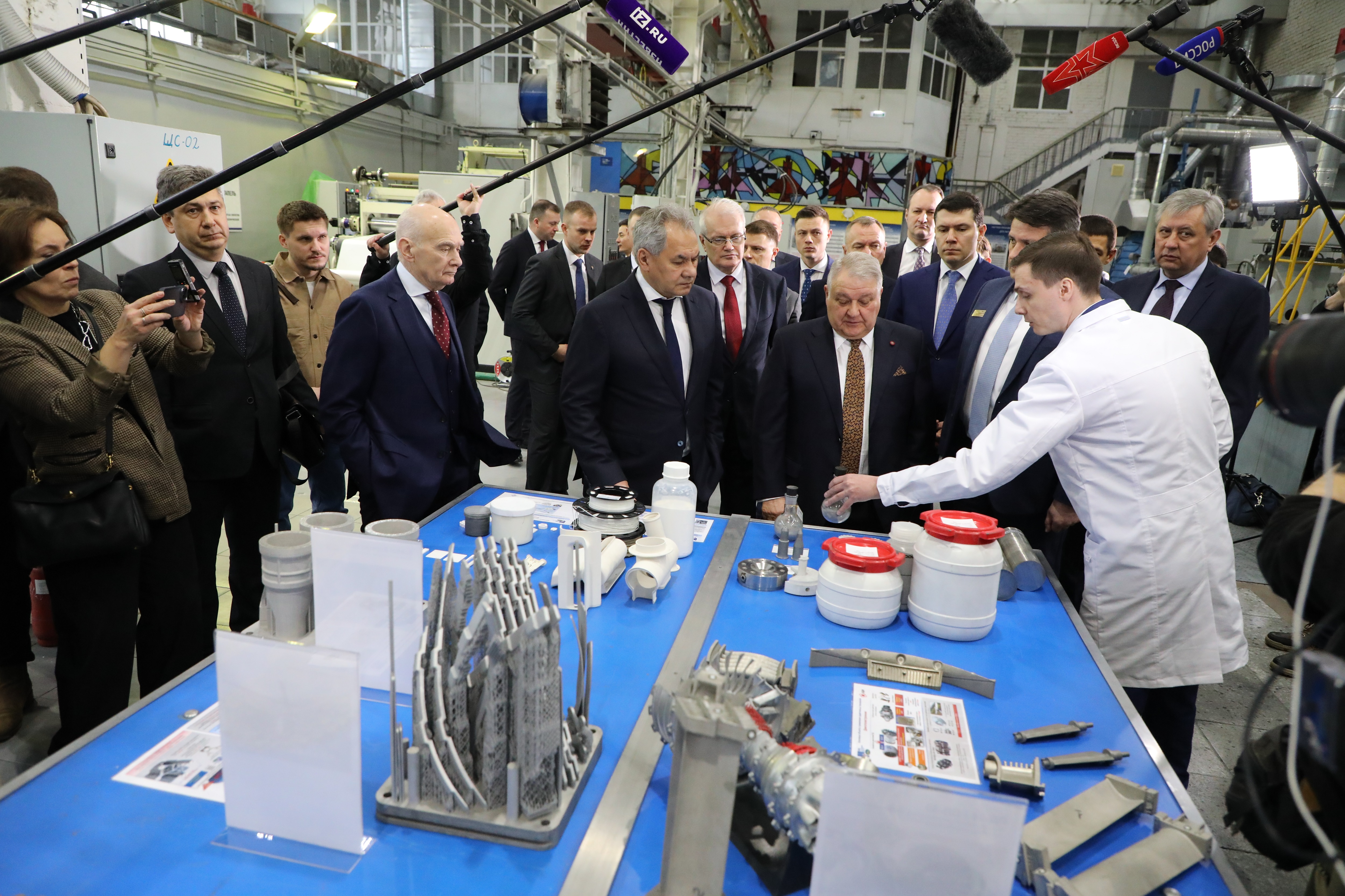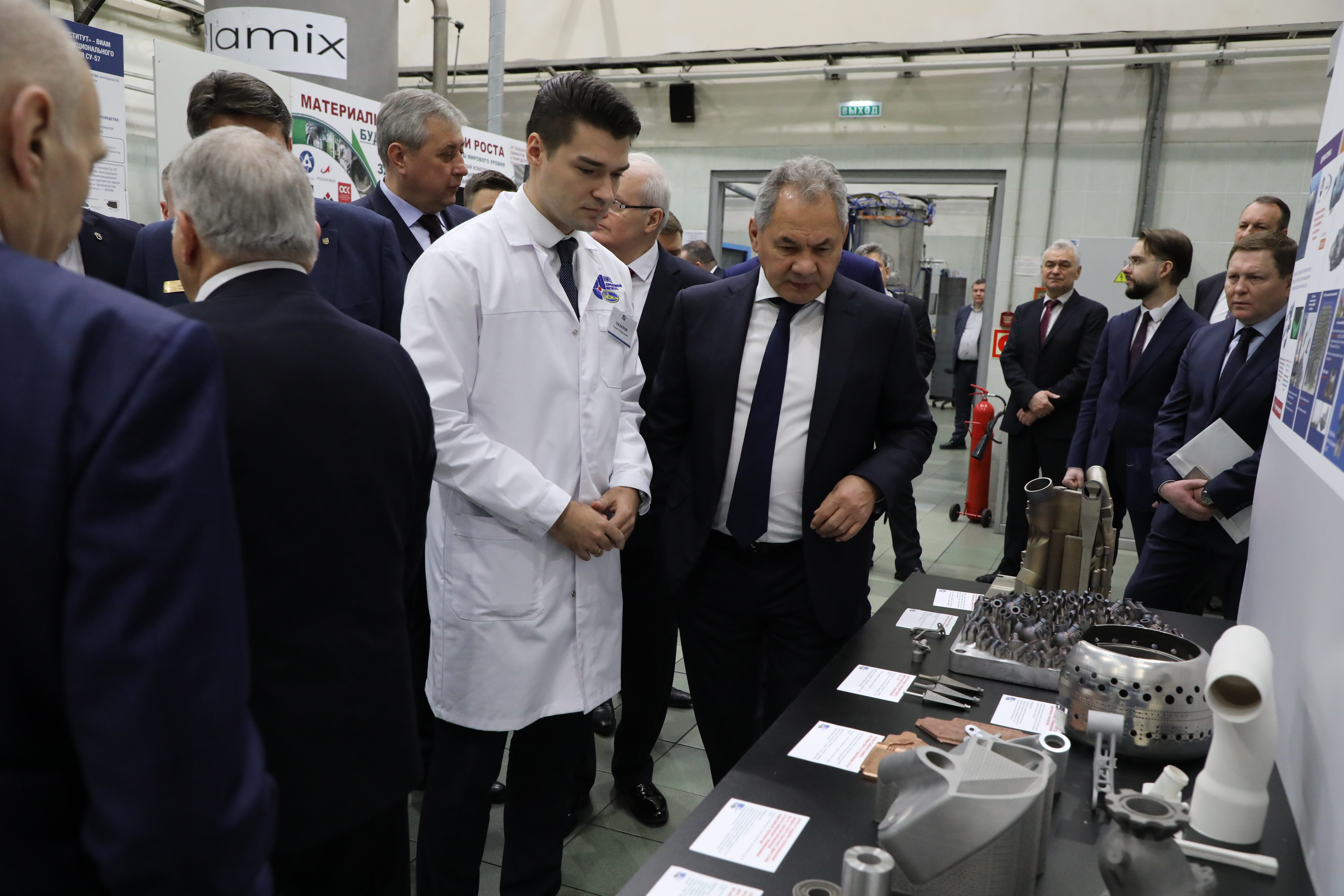 С.Шойгу продемонстрировали созданный в 2014 году полный цикл аддитивного производства, включающий все стадии процесса – от выплавки шихтовой заготовки и ее распыления до синтеза готовых деталей и их последующей обработки.