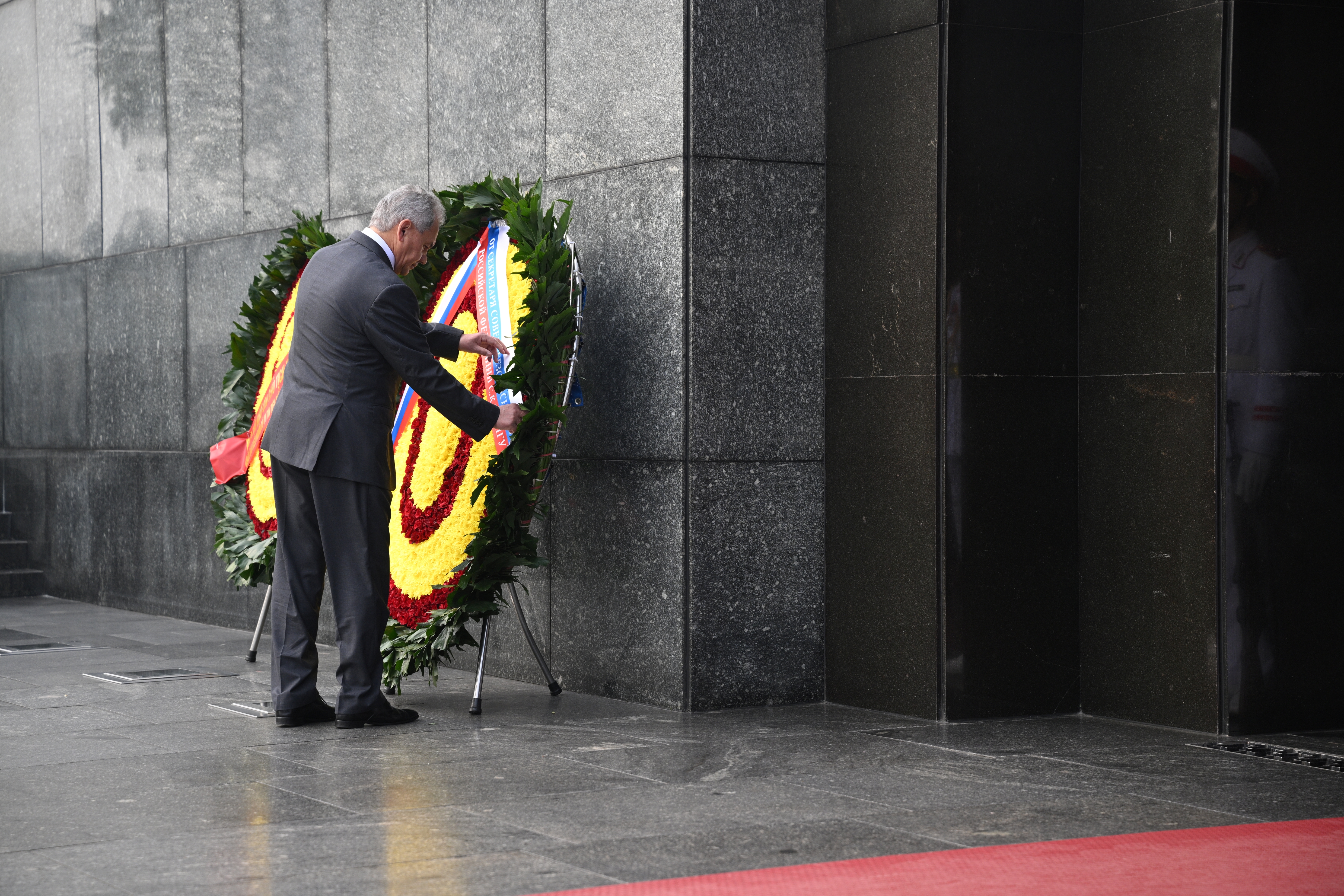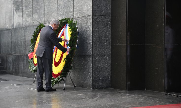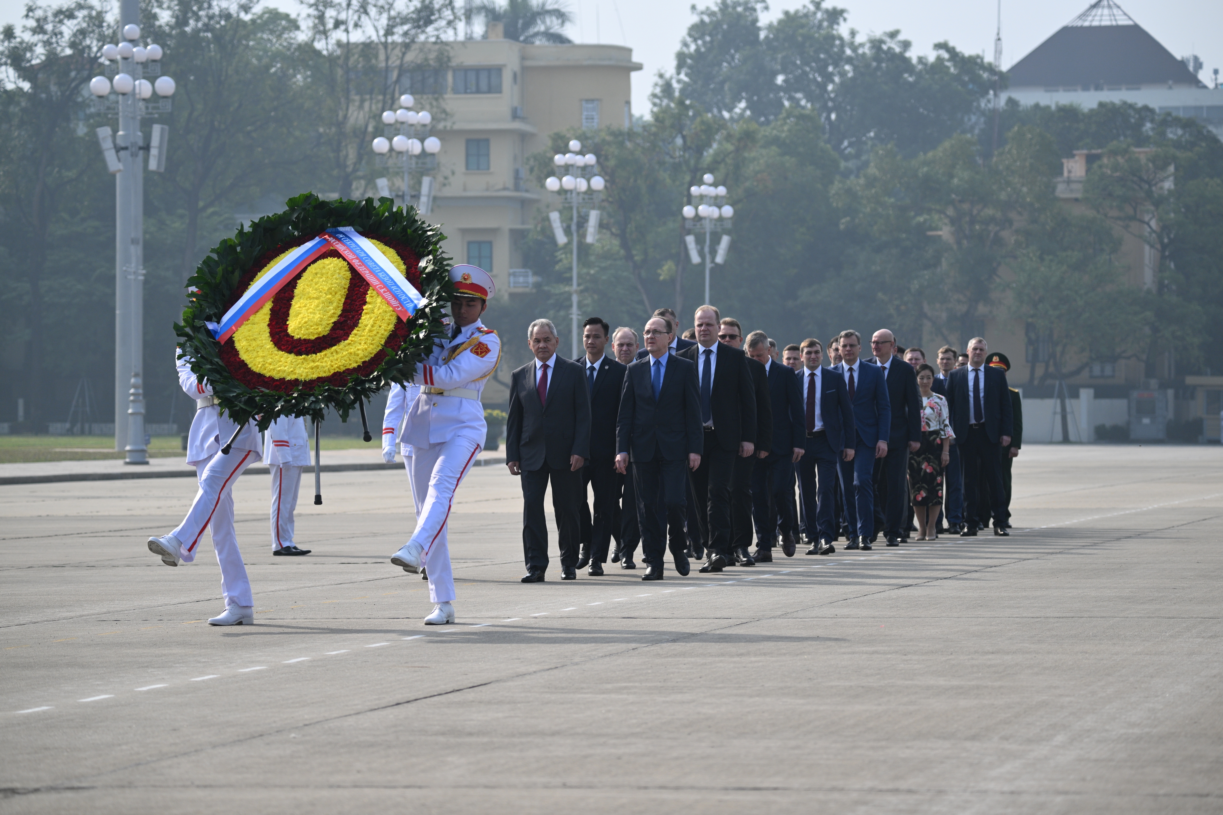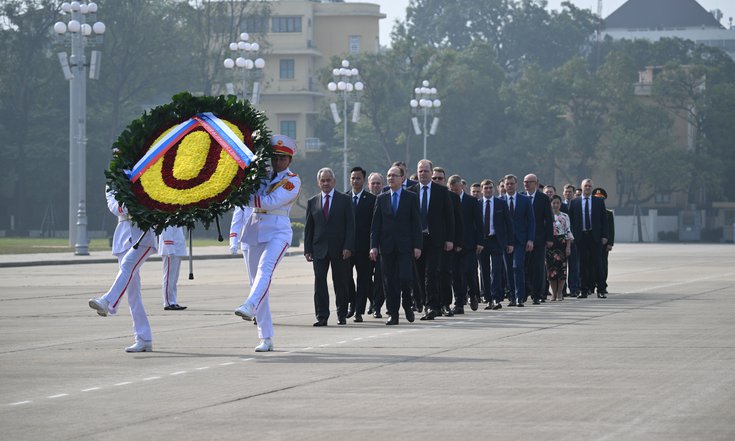 Венки от Совета Безопасности Российской Федерации в присутствии российской делегации возложил к Памятнику павшим героям и Мавзолею Хо Ши Мина почетный караул.